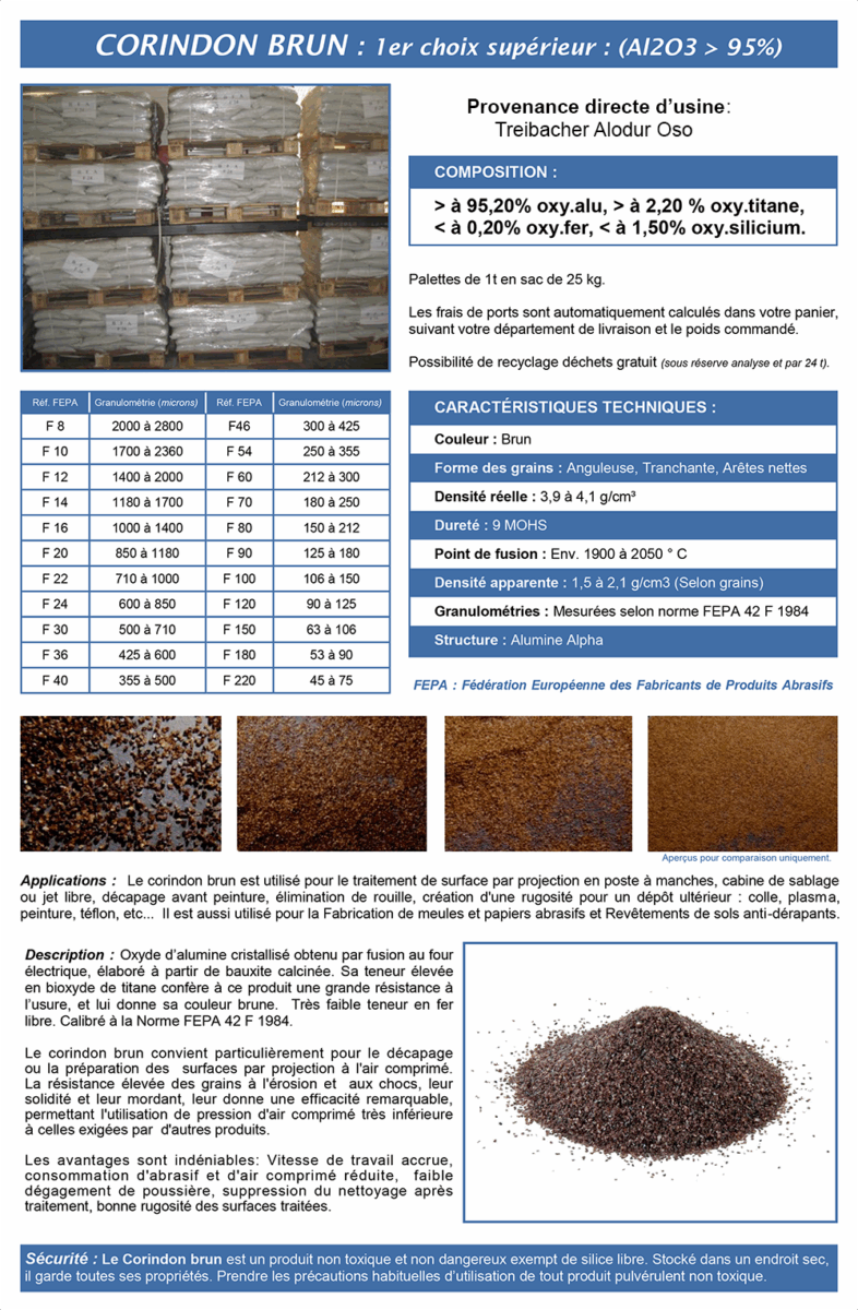 | 9874 | Corindon brun F 100 (106µ -150µ) (la tonne) avec surcharge 150 E) | 1264,70 € | |