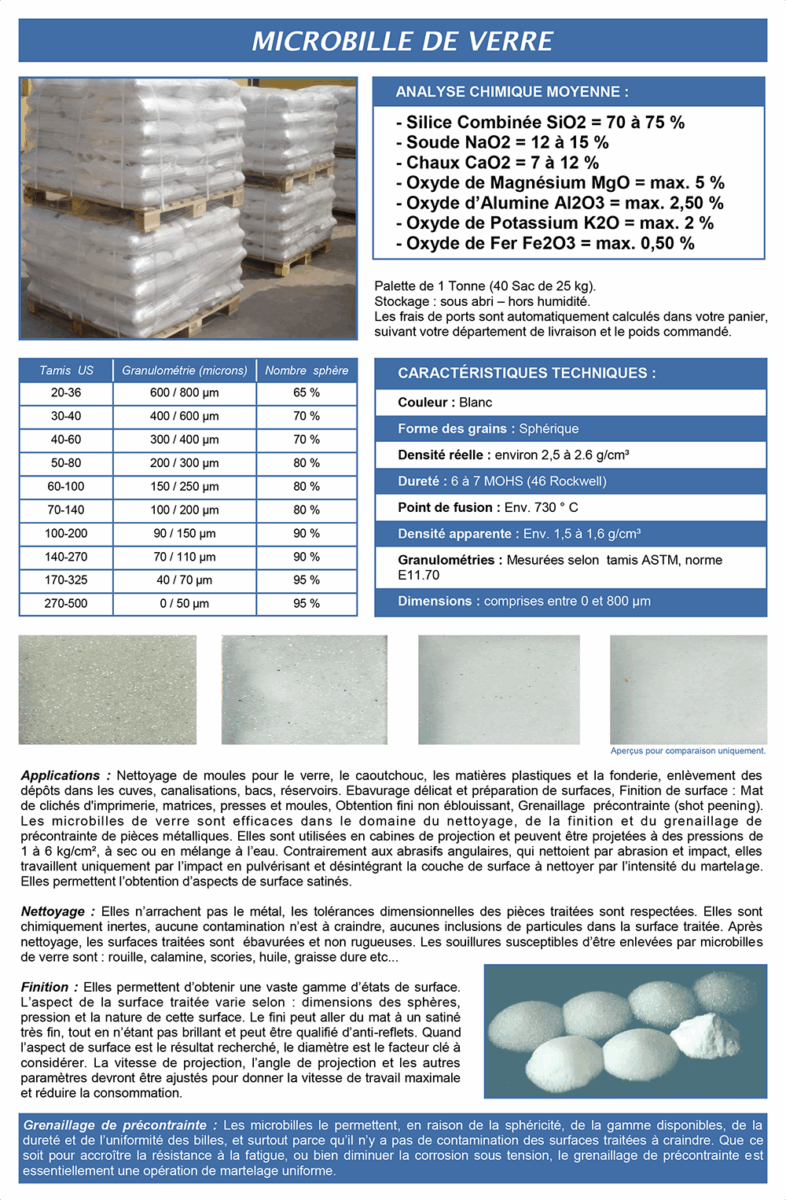 | 9886 | Microbille de Verre (400 / 600 µm) (la tonne) | 824,30 € |