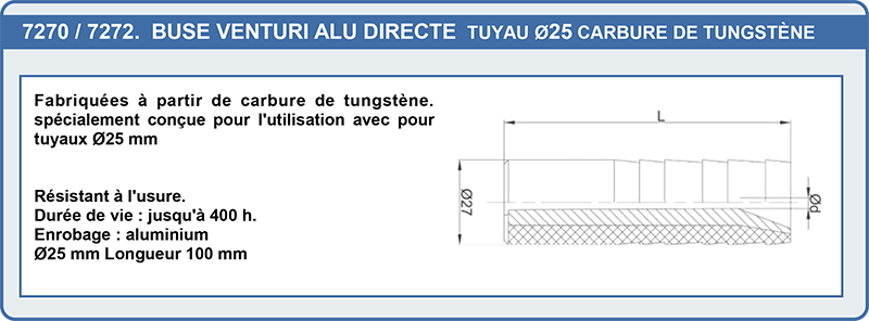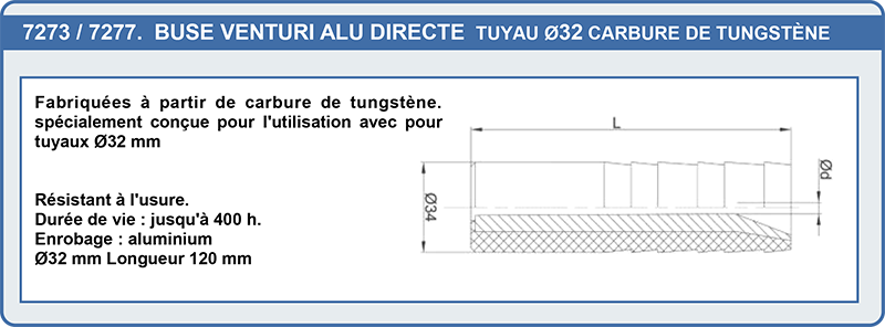 | 7276 | Buse venturi alu Tungstène ø11 Lg : 120 mm | 91,10 € | |