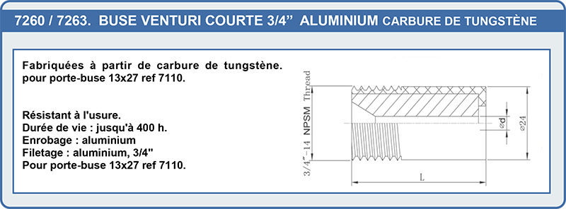 | 7262 | Buse venturi courte 3/4 alu Tungstène ø6.5 Lg : 45 mm | 65,90 € | |