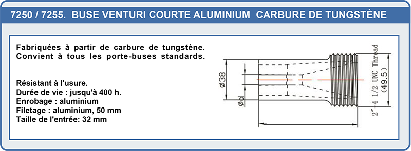 | 7255 | Buse venturi courte alu Tungstène ø12.5 Lg : 80 mm | 119,20 € |