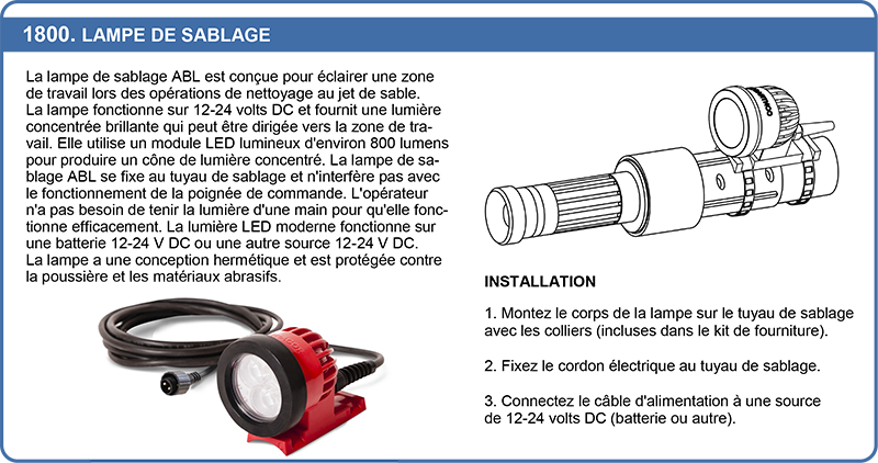 | 1800 | Lampe LED de sablage 800 lumens. 12-24 V DC. cable 1.5m | 249,50 € | |