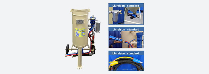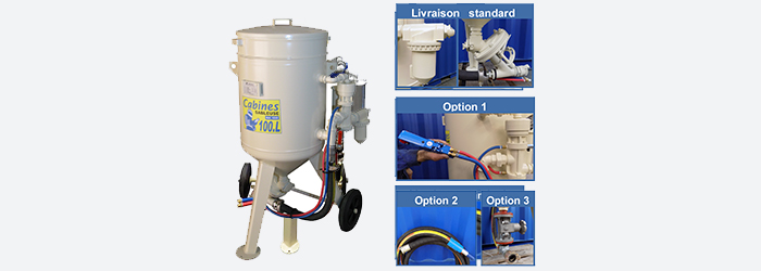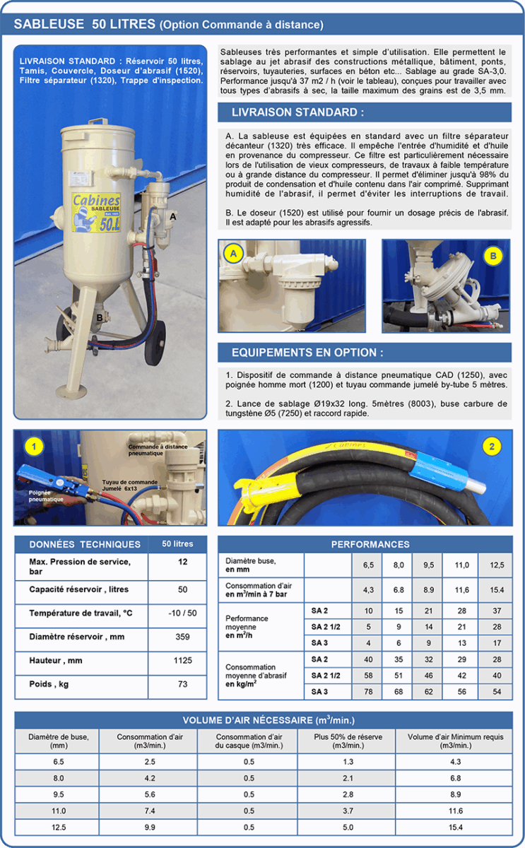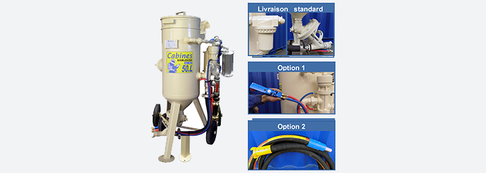 | 1005 | Sableuse 50 litres avec: - (A) Filtre décanteur réf.1320 + (B) Doseur abrasif réf.1520 - Option 1: CAD réf.1250 + jumelé 5m réf.8224 + poignée réf.1200 - Option 2: Lance 5m réf.8003 + Buse ø 5 réf.7250  | 1950,30 € |
