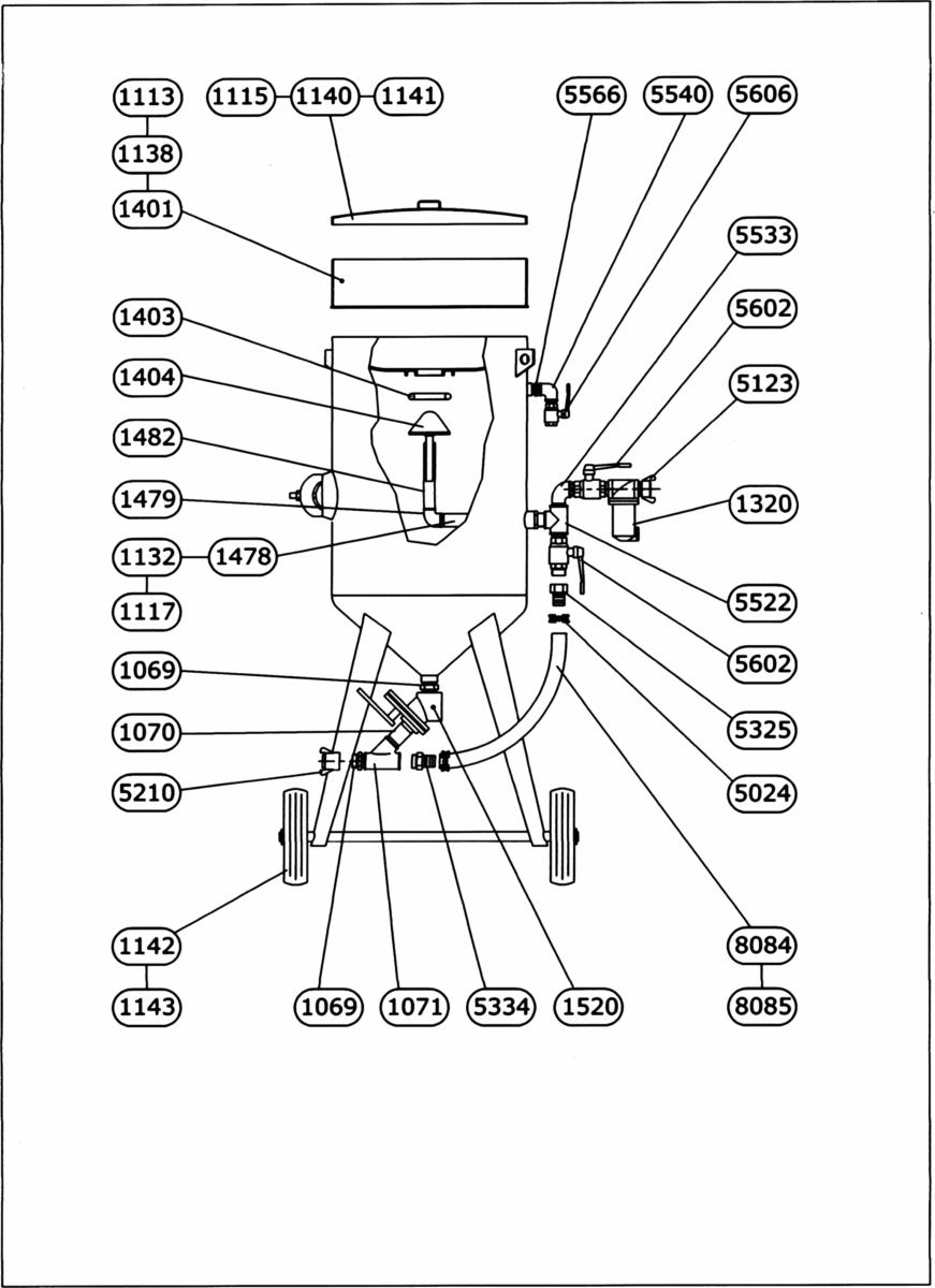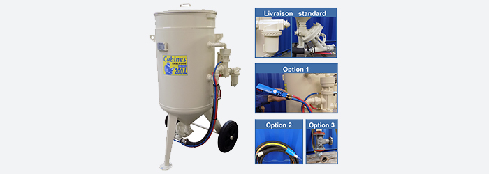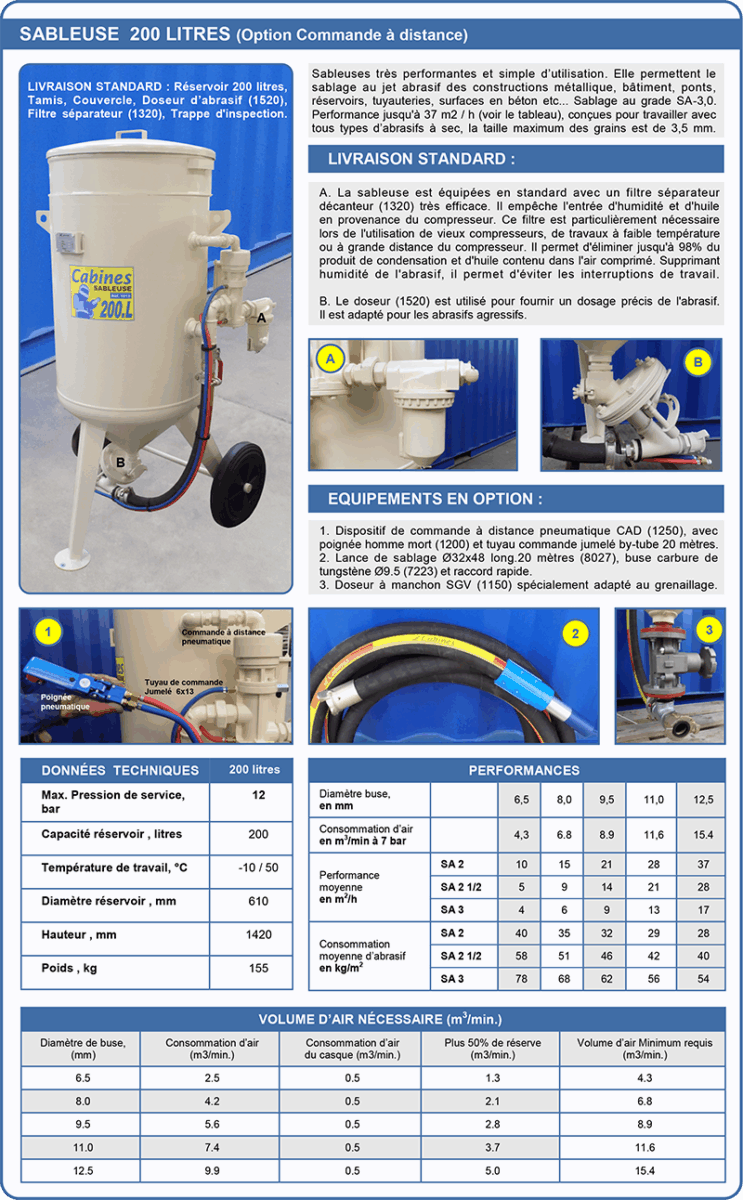 | 1012 | Sableuse 200 litres avec: - (A) Filtre décanteur réf.1320 + (B) Doseur FSV réf.1520 - OPTION 1: CAD réf.1250. jumelé 20m réf.8226 + poignée réf.1200 - OPTION 3: Doseur grenaille à manchon SGV réf.1150  | 2350,40 € | |