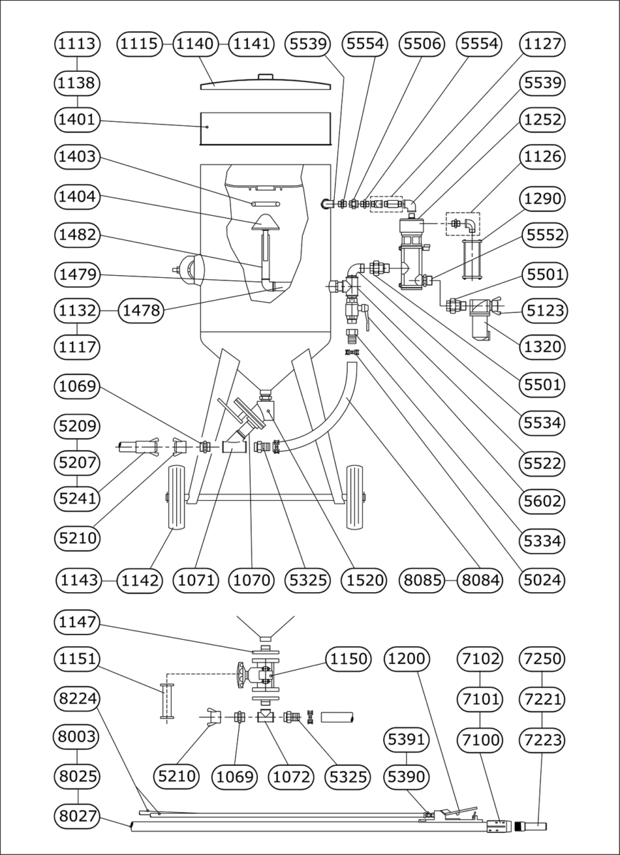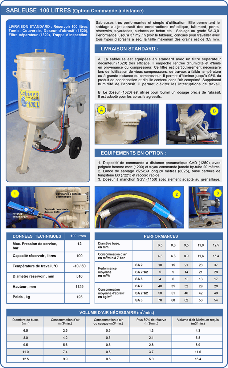 | 1007 | Sableuse 100 litres avec: - (A) Filtre décanteur réf.1320 + (B) Doseur FSV réf.1520 - OPTION 1: CAD réf.1250 + jumelé 20m réf.8226 + poignée réf.1200  | 2096,30 € | |