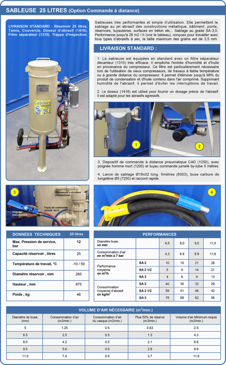 | 1013 | Sableuse 200 litres avec: - (A) Filtre décanteur réf.1320 + (B) Doseur FSV réf.1520 - OPTION 1: CAD réf.1250. jumelé 20m r?f.8226 + poignée réf.1200 - OPTION 2: Lance 20m réf.8027 + Buse ? 9.5 réf.7223  | 2534,70 € |