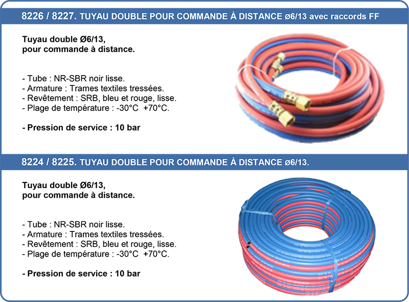 | 8226 | Tuyau jumelé ø6 x 13. rouge/bleu (20 m équipé raccords) | 98,10 € | |
